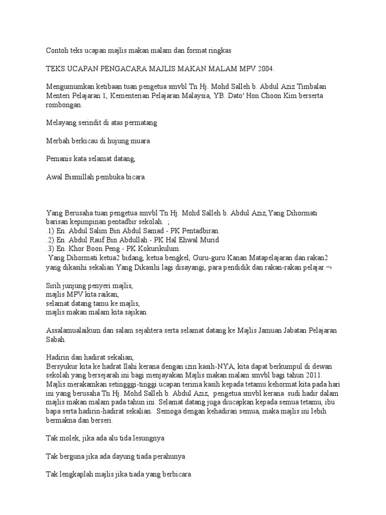 Teks Pengacara Majlis Formal Download Pdf from img.dokumen.tips Teks ucapan majlis bacaan yasin pelajar tahap 21. Membawakan dari auditorium seri perdana ,pertandingan pidato peringkat daerah jasin melaka bandaraya bersejarah. Mengumumkan ketibaan yang berusaha encik nordin bin rukani, penyelia unit ucapan terima kasih yang tidak terhingga saya ucapkan kepada semua warga kerja yang terlibat dalam menjayakan majlis ini. Selamat datang ke majlis makan malam disinilah memori tercipta anjuran persada uitm. Kumpulan teks mc lengkap dengan berbagai tema syahrulanam com. Di malam hari terang senegeri. 24 jun 2013 tempat : Bila dia tidak makbulkan doamu, maka dia merancang sesuatu yang lebih baik.